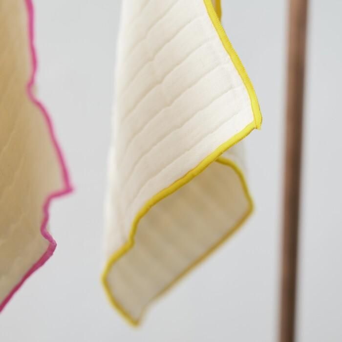 ネオンカラーのパイピングが、ナチュラルなガーゼに軽やかなアクセントを添えて