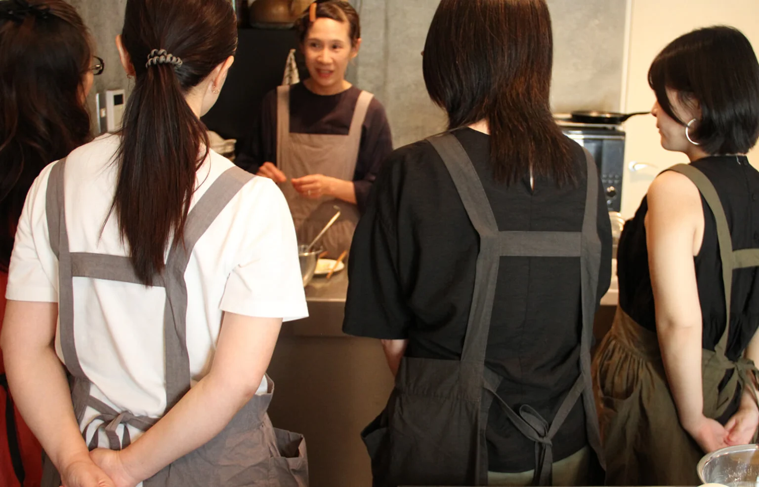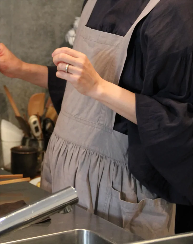 女性的でありながら甘すぎず、素材の風合いを生かしたエプロンが、教室全体の空気感に自然に溶け込みます。